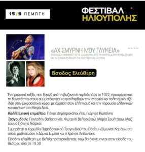 “Αχ Σμύρνη μου γλυκειά” Εκδήλωση μνήμης για τα 100 χρόνια απο τη Μικρασιατική Καταστροφή με την Συνδιοργάνωση της Περιφέρειας Αττικής