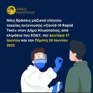 ΝΕΕΣ ΔΡΑΣΕΙΣ COVID-19 RAPID TEST ΣΤΟΝ ΔΗΜΟ ΗΛΙΟΥΠΟΛΗΣ ΔΕΥΤΕΡΑ 27 ΙΟΥΝΙΟΥ ΚΑΙ ΤΗΝ ΠΕΜΠΤΗ 30 ΙΟΥΝΙΟΥ 2022