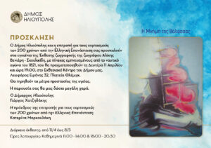 Ο Δήμος Ηλιούπολης και η επιτροπή για τους εορτασμούς των 200 χρόνων από την Ελληνική Επανάσταση σας προσκαλούν στα εγκαίνια της Έκθεσης ζωγραφικής της ζωγράφου