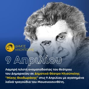 Σε μία λαμπρή τελετή, που θα πραγματοποιηθεί το Σάββατο 9 Απριλίου 2022 στις 20:00, θα γίνει η επίσημη ονοματοδοσία του κλειστού Θεάτρου του Δημαρχείου σε