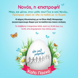 Το Σάββατο 9 Απριλίου 2022, από τις 10:00 έως τις 14:00, στο Δημαρχείο της πόλης μας συγκεντρώνουμε πασχαλινά δώρα, λαμπάδες, παπούτσια, παιχνίδια και ό,τι άλλο