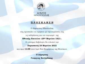Ο Δήμαρχος Ηλιούπολης σας προσκαλεί να τιμήσετε με την παρουσία σας τις εκδηλώσεις για τον εορτασμό της Εθνικής Επετείου «25ηςΜαρτίου 1821». Η επίσημη δοξολογία θα