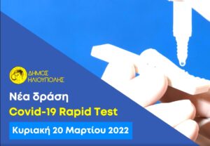 Νέα δράση μαζικού ελέγχου ταχείας ανίχνευσης «Covid-19 Rapid Test» από κλιμάκιο του ΕΟΔΥ, την Κυριακή 20 Μαρτίου 2022, από 09:30 έως 14:30, στην Αίθουσα Συνεδριάσεων