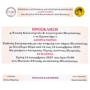 Η Ένωση Καλλιτεχνών & Λογοτεχνών Ηλιούπολης «Το Εργαστήρι» διοργανώνει με την υποστήριξη του Δήμου Ηλιούπολης, Έκθεση Ζωγραφικής με ελεύθερο θέμα στο Μουσείο Εθνικής Αντίστασης Ηλιούπολης (Μαρίνου Αντύπα & Σοφοκλή Βενιζέλου, Πλατεία