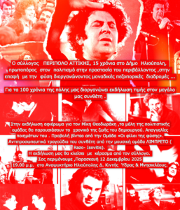 19.00 στο Αναψυκτήριο Ηλιούπολης Δ. Κιντής Ύδρας & Μνησικλέους Σας πλαίσια του εορτασμού για τα 100 χρόνια του Δήμου Ηλιούπολης σας καλούμε στη εκδήλωση αφιερωμένη