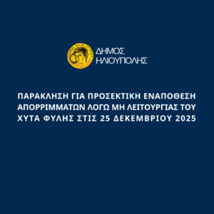 ΑΝΑΚΟΙΝΩΣΗ “ΠΑΡΑΚΛΗΣΗ ΓΙΑ ΠΡΟΣΕΚΤΙΚΗ ΕΝΑΠΟΘΕΣΗ ΑΠΟΡΡΙΜΜΑΤΩΝ ΛΟΓΩ ΜΗ ΛΕΙΤΟΥΡΓΙΑΣ ΤΟΥ ΧΥΤΑ ΦΥΛΗΣ ΣΤΙΣ 25 ΔΕΚΕΜΒΡΙΟΥ 2025”