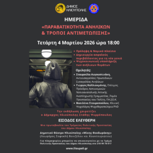 Διοργάνωση Ημερίδας με τίτλο "Παραβατικότητα & Τρόποι Αντιμετώπισης" από το τμήμα Πολιτικής Προστασίας του Δήμου Ηλιούπολης την Τετάρτη 4 Μαρτίου 2026