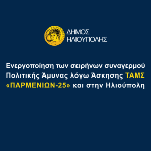 Σήμερα, Τετάρτη 01 Οκτωβρίου 2025, κατά την Άσκηση ΤΑΜΣ «ΠΑΡΜΕΝΙΩΝ-25». θα πραγματοποιηθεί δοκιμαστική ενεργοποίηση του συνόλου των σειρήνων συναγερμού Πολιτικής Άμυνας, σε όλη την επικράτεια,