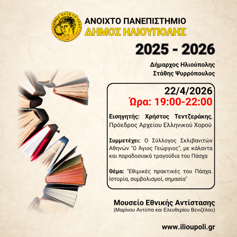 Εκδήλωση του Δήμου Ηλιούπολης και της Δημοτικής Επιτροπής Ισότητας με θέμα «Η Συμβολή των Γυναικών στην Ελληνική Επανάσταση» την Κυριακή 22 Μαρτίου 2026 στις 18:30 μ.μ. στο Μουσείο Εθνικής Αντίστασης